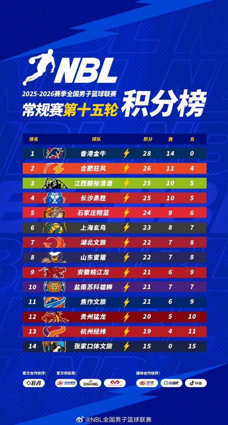 配资炒股官网官网 NBL积分榜:香港金牛14连胜领跑 合肥、江西、长沙分列二至四位