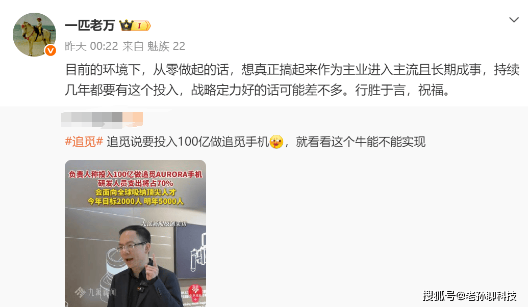 面对追觅品牌号称要打造高端旗舰手机,魅族高管万志强公开发文鼓励。万志强认为,当前环境从零做起,想要成功需要持续几年都有高投入,战略定力好的话可能差不多,行胜于言,祝福。